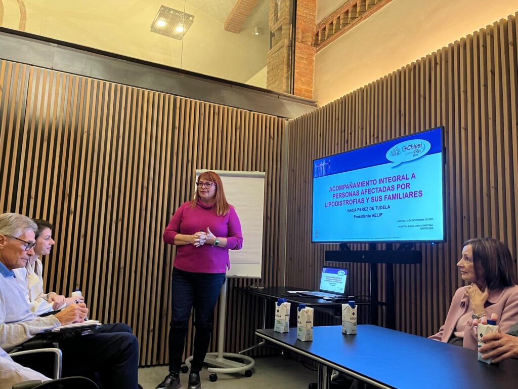 Durante la sesión dedicada a enfermedades raras, intervinieron la presidenta de AELIP, Naca Pérez de Tudela, y la delegada de AELIP en Cataluña, Raquel Valiente, poniendo en valor los servicios que ofrece AELIP para acompañar en el día a día a las personas afectadas por lipodistrofias y sus familias. Su intervención subrayó el compromiso de la entidad para garantizar una buena calidad de vida a quienes conviven con una lipodistrofia, tanto los enfermos como sus familiares.