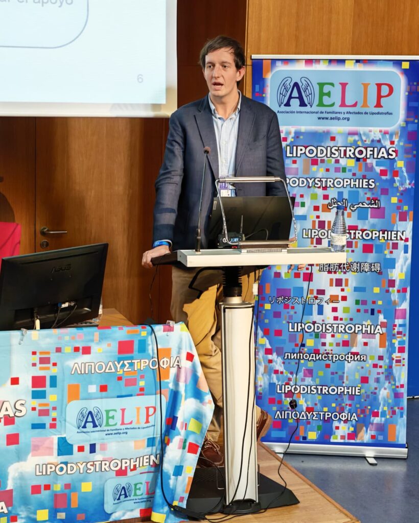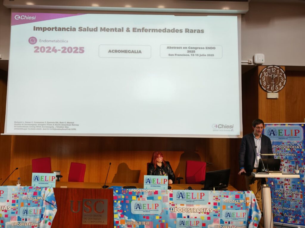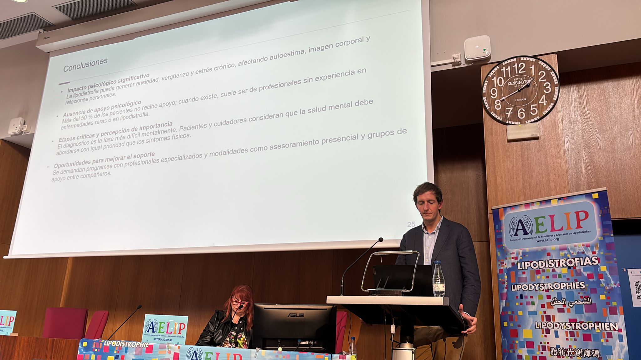 Tras los emotivos testimonios de familiares y personas afectadas por lipodistrofias, Óscar Orrios, del Departamento Médico de Chiesi España, tomó la palabra para presentar una encuesta pionera sobre lipodistrofia y salud mental dirigida a pacientes, cuidadores y familiares.