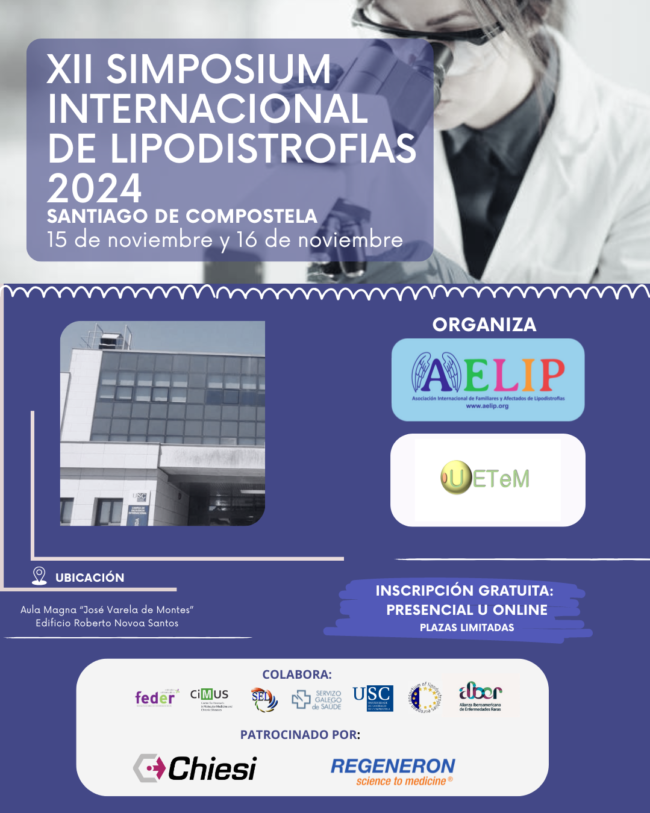 La Asociación Internacional de Familiares y Afectados de Lipodistrofias AELIP organizará el 15 y 16 de noviembre Duodecima edición del Simposium Internacional de Lipodistrofias. El Aula Magna Del Edificio Docente Roberto Novoa Santos – USC se convertirá durante dos días en la capital mundial de las Lipodistrofias con la celebración del XlI simposium Internacional de…