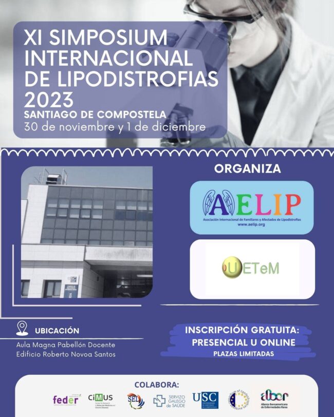 15/11/2023 La Asociación internacional de Familiares y Afectados de Lipodistrofias AELIP; celebrará El XI SIMPOSIUM INTERNACIONAL DE LIPODISTROFIAS en Santiago de Compostela los próximos 30 de noviembre y 1 de diciembre de 2023, de forma presencial y online, y contará con interpretación simultánea inglés-castellano-portugués. El simposium presentará en su primer día una jornada científica llevada a cabo…