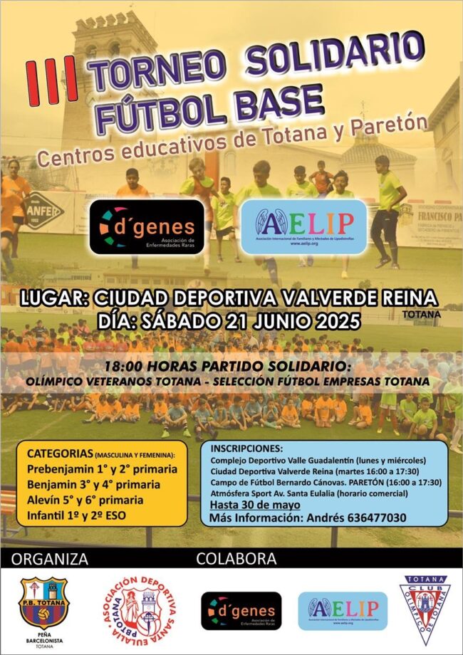 La Ciudad Deportiva Valverde Reina acoge el III Torneo Solidario de Fútbol Base a beneficio de D´Genes y AELIP El próximo 21 de junio, la Ciudad Deportiva Valverde Reina será el escenario del III Torneo Solidario de Fútbol Base de Centros Educativos de Totana y Paretón, una jornada deportiva y solidaria que reunirá a los…