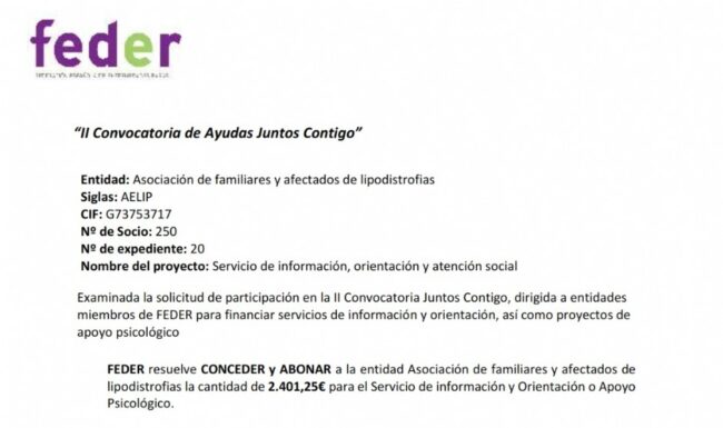 Examinada la solicitud de participación en la II Convocatoria Juntos Contigo, dirigida a entidades miembros de FEDER para financiar servicios de información y orientación, así como proyectos de apoyo psicológico, FEDER ha resuelto  CONCEDER y ABONAR a la entidad Asociación de familiares y afectados de lipodistrofias la cantidad de 2.401,25€ para el Servicio de información…